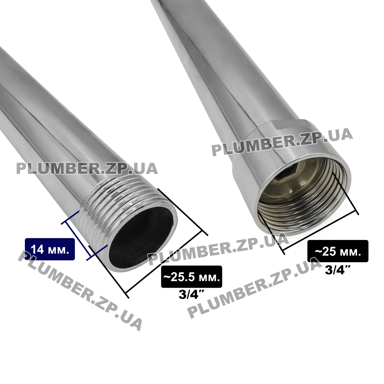 З одного боку подовжувач оснащений зовнішньою різьбою 3/4" (діаметр у міліметрах приблизно 25.5 мм. з урахуванням зубців різьби), а з іншого боку передбачена накидна гайка з такою ж, але внутрішньою різьбою 3/4" (у міліметрах діаметр отвору приблизно 24.5 мм.). Таке виконання робить підключення максимально зручним і універсальним, дозволяючи легко монтувати подовжувач до душової стійки чи труби для верхнього душу без потреби у додаткових перехідниках.